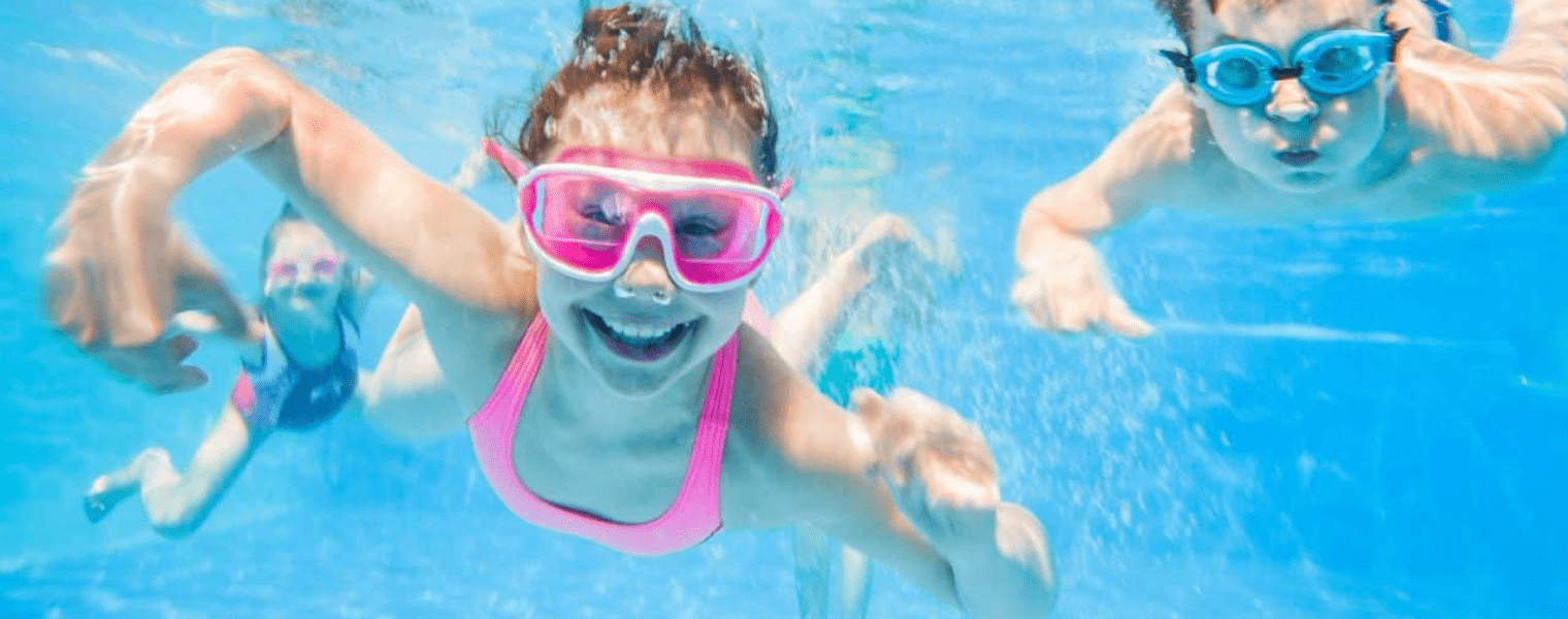 Three children swim underwater in a pool, wearing goggles. They smile and reach towards the camera, creating a joyful and playful scene. Light reflections ripple on the water, enhancing the bright and cheerful atmosphere.